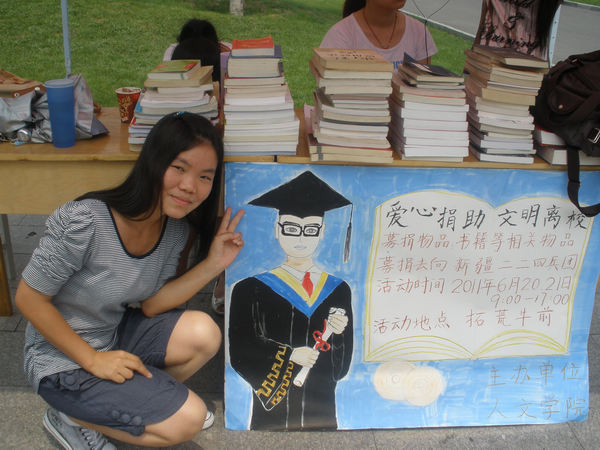 二是,时值六月份,这是毕业的季节。我们通过毕业募捐这一形式,能使大四毕业生那些不打算从学校带走的东西再次发挥效用,在避免浪费的同时帮助了他人。在募捐现场,就有师兄师姐们高兴地说:“其实早就想捐了,东西一直是收好了的,现在刚好看到就送过来了,很谢谢你们办的活动,很有意义。”“东西用久了就不想再用了,但是丢掉很可惜也很浪费,所以就捐过来了,这样的活动还是很好的。”