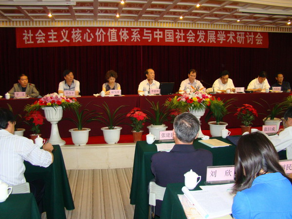 李德顺教授作为会长致开幕辞并做题为“社会主义核心价值与当代普世价值”的主旨发言。他在主题发言中指出,社会主义核心价值的提炼要有开阔的视野,在表述对象上要甄别主体层次的差异性,将主体界定为“中国特色社会主义”;在表述来源上,要以社会主义思想体系及其社会运动发生发展的历史和经验为依据,以改革开放以来中国特色社会主义实践为根据;在表述内容上,要将“体系的核心”与“主体的核心”区别开来,既要表达出人民的需要和意志,还要在结构和秩序上形成一完整体系;在表述导向上,要将中国特色的个性置于人类共同文明的背景之下,自觉追求与人类文明进步方向一致的先进性,从而体现自我个性的优越性。
