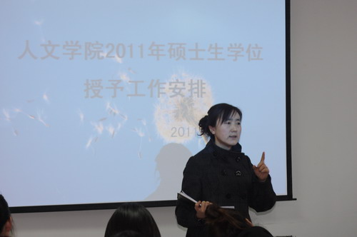 会上,结合学校《关于做好2010—2011学年第二学期研究生毕业审查和学位授予工作的通知》与《人文学院硕士研究生2011年毕业审查和学位授予工作日程安排》,罗老师特别介绍了毕业前包括学位授予工作程序中各个环节等应该注意的问题: