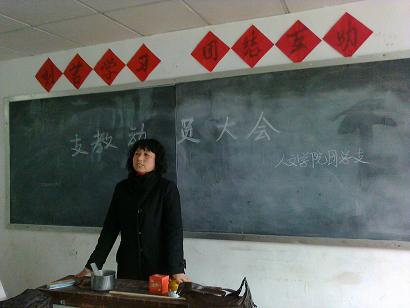 大会于下午四点三十分正式开始,团总支实践部陈依虹主持大会。会场设置在棚鹰小学的五年级教室,学校设施简陋,仅仅在黑板上用白色粉笔写了“人文学院心语支教动员大会”几字,但坐在平时孩子们上课的教室里,让志愿者们感受到了一种独特的温暖。主持人首先向志愿者们介绍了“心语支教”的情况,使志愿者们对我们的这一品牌活动有了更深一步的了解。随后,棚鹰小学的常务负责人赵老师代表学校发言。她首先肯定了我院主办了五年的支教活动的成果,并代表学校领导及学生向志愿者们表示了感谢,接着,她介绍了棚鹰小学近年来的发展情况,表示对学校的未来充满了希望;赵老师还重点向志愿者们详细地讲述了授课时的注意事项,相信会帮助志愿者们提高课堂效率,在与学生们友好相处的同时提高授课质量。最后,实践部部长刘一萌对大会进行了总结,并再次向志愿者们对我们活动的支持表示了感谢。大会气氛活跃,志愿者中间不时爆发出一阵阵笑声和掌声,他们认真听取了支教的建议及意见,大会在持续了近一个小时之后圆满结束。随后,志愿者们熟悉了校园,为即将开始的支教活动做准备。