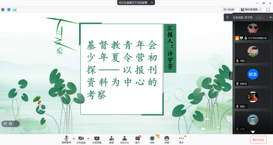 第三位报告人是人文学院2019级专门史硕士研究生许宇芳,她报告的论文是《基督教青年会少年夏令营初探——以报刊资料为中心的考察》。文章介绍少年夏令营的由来,中华基督教青年会少年夏令营的兴起与运作,并对其优劣得失进行评价。论文评议人为人文学院2019级中国近现代史硕士研究生何真,她认为文章选题新颖、史料丰富、内容完整,但对夏令营概念缺乏界定,且存在错别字和标点符号混用问题。