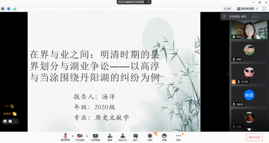 第一位报告人是人文学院历史文献学2020级硕士研究生汤洋,她报告的论文是《在界与业之间:明清时期的县界划分与湖业争讼——以高淳与当塗围绕丹阳湖的纠纷为例》,论文从丹阳湖域湖民以湖为生、谋取湖利的事例出发,讨论当地湖民纠纷的发生原因和解决方式。同时,她探讨争讼中湖面的划分与划界的意义,以及湖界划分与当地人利用湖利之间的关系。人文学院专门史2020级硕士研究生刘依龙对论文进行评议,充分肯定了文章选题价值高,史料丰富扎实,但存在附图不规范、论证不够严谨等问题。
