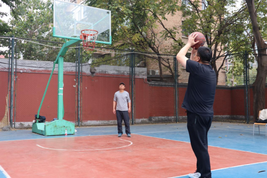 单人篮球投篮比赛也在另一个场地上紧张进行,随着裁判一声哨响,选手们都将注意力集中在篮筐上,不断调整出手弧度,选择最佳的投篮姿态,尽量提高投篮命中率。定点投篮比赛不仅是体力的竞争,更需要参赛者极高的心理素质。尽管并非每人都能百投百中,但不管投中与否,选手们都相互喝彩,鼓劲,赛场上充满着浓浓的友情,现场的观众也越聚越多,时而为选手们的精彩进球一起欢呼,时而为选手们的错失机会长吁短叹。比赛虽然竞争激烈,现场的选手和观众们的脸上却都洋溢着开心的笑容。